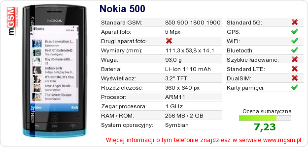 Masz swoją stronę? Chcesz wstawić gdzieś informacje o podstawowych danych telefonu Nokia 500 ? To bardzo proste. Możesz pobrać obrazek, lub skopiować i wkleić na stronę poniższy kod:Wklejenie tego kodu spowoduje wyświetlenie poniższego obrazka:
