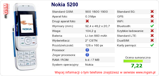 Dane telefonu Nokia 5200 na Twojej stronie