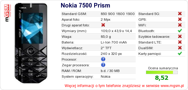 Dane telefonu Nokia 7500 Prism na Twojej stronie
