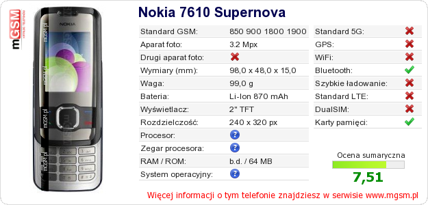 Dane telefonu Nokia 7610 Supernova na Twojej stronie