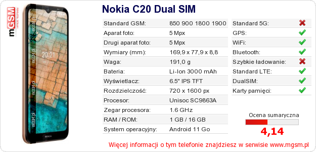 Dane telefonu Nokia C20 Dual SIM na Twojej stronie