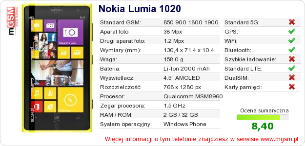 Dane telefonu Nokia Lumia 1020 na Twojej stronie