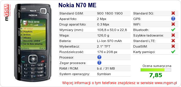Dane telefonu Nokia N70 ME na Twojej stronie