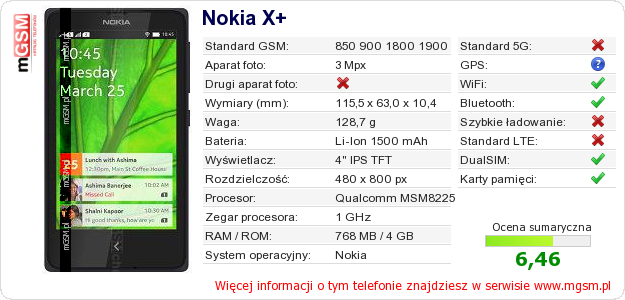 Dane telefonu Nokia X+ na Twojej stronie