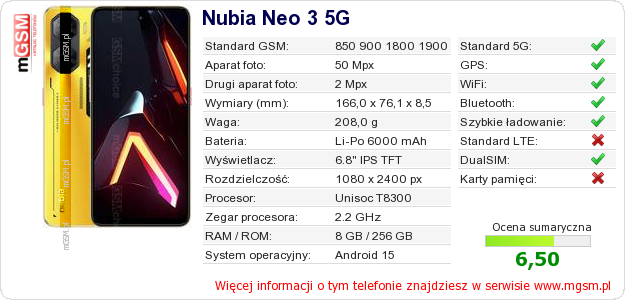 Dane telefonu Nubia Neo 3 5G na Twojej stronie