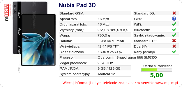 Dane telefonu Nubia Pad 3D na Twojej stronie