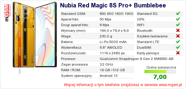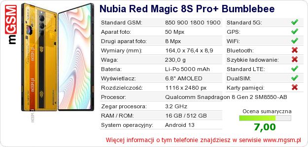Dane telefonu Nubia Red Magic 8S Pro+ Bumblebee na Twojej stronie