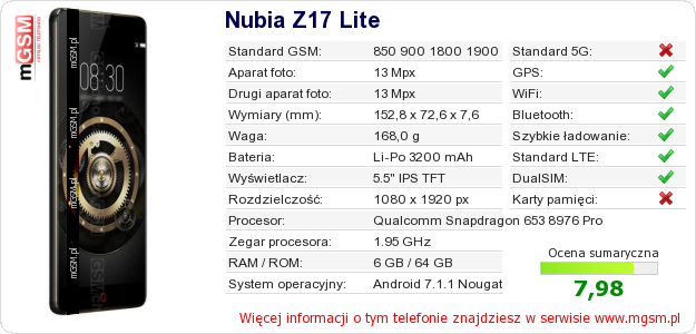 Dane telefonu Nubia Z17 Lite na Twojej stronie