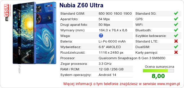 Dane telefonu Nubia Z60 Ultra na Twojej stronie