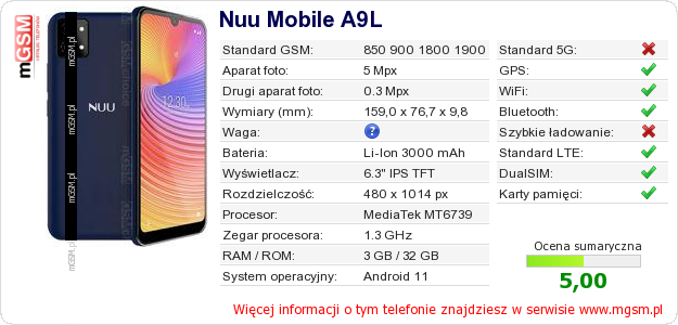 Dane telefonu Nuu Mobile A9L na Twojej stronie