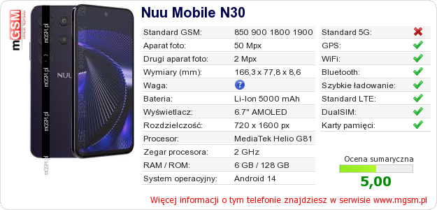 Dane telefonu Nuu Mobile N30 na Twojej stronie