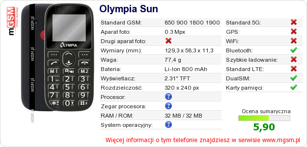 Dane telefonu Olympia Sun na Twojej stronie
