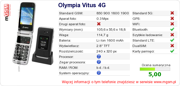Dane telefonu Olympia Vitus 4G na Twojej stronie