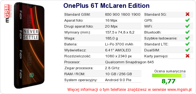 Dane telefonu OnePlus 6T McLaren Edition na Twojej stronie