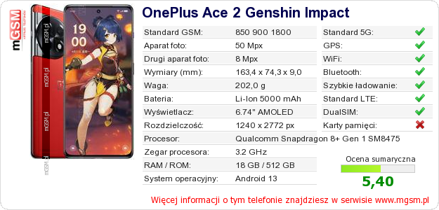 Dane telefonu OnePlus Ace 2 Genshin Impact na Twojej stronie