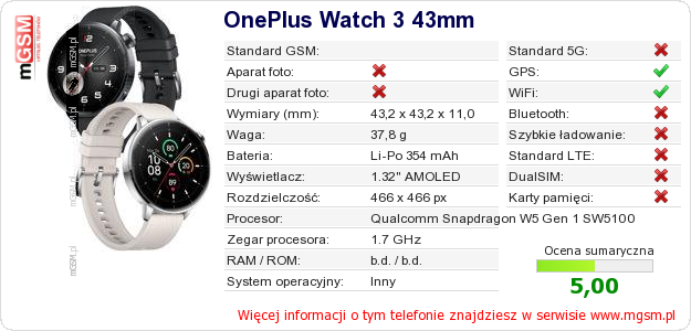 Dane telefonu OnePlus Watch 3 43mm na Twojej stronie
