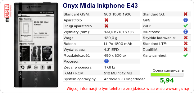 Dane telefonu Onyx Midia Inkphone E43 na Twojej stronie