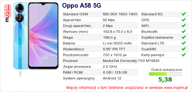 Dane telefonu Oppo A58 5G na Twojej stronie