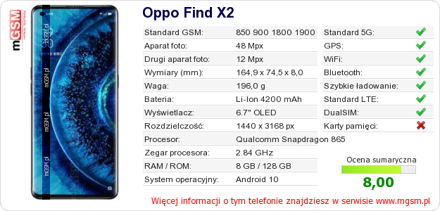 Dane telefonu Oppo Find X2 na Twojej stronie