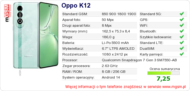 Dane telefonu Oppo K12 na Twojej stronie
