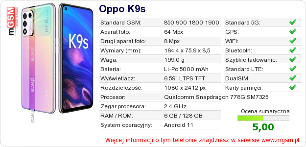 Dane telefonu Oppo K9s na Twojej stronie