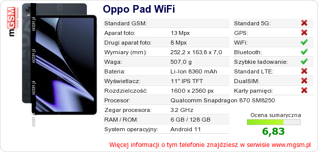 Dane telefonu Oppo Pad WiFi na Twojej stronie