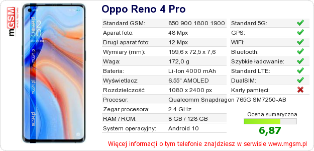 Dane telefonu Oppo Reno 4 Pro na Twojej stronie