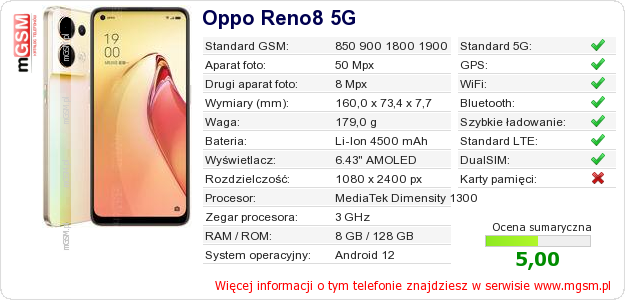 Dane telefonu Oppo Reno8 5G na Twojej stronie