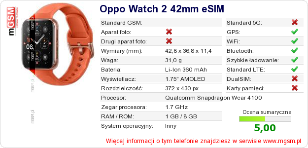 Dane telefonu Oppo Watch 2 42mm eSIM na Twojej stronie