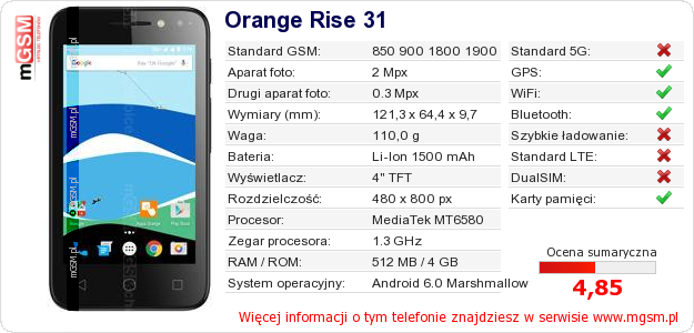 Dane telefonu Orange Rise 31 na Twojej stronie