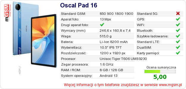 Dane telefonu Oscal Pad 16 na Twojej stronie
