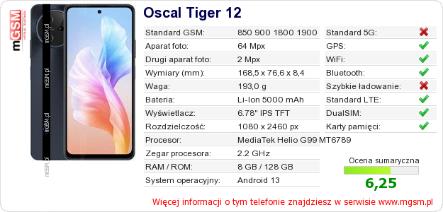 Dane telefonu Oscal Tiger 12 na Twojej stronie
