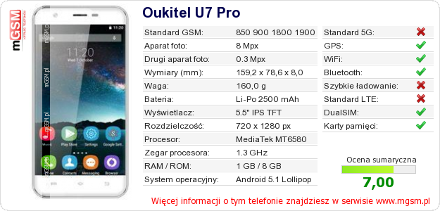 Dane telefonu Oukitel U7 Pro na Twojej stronie