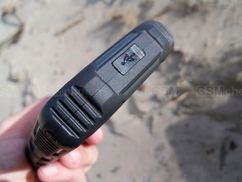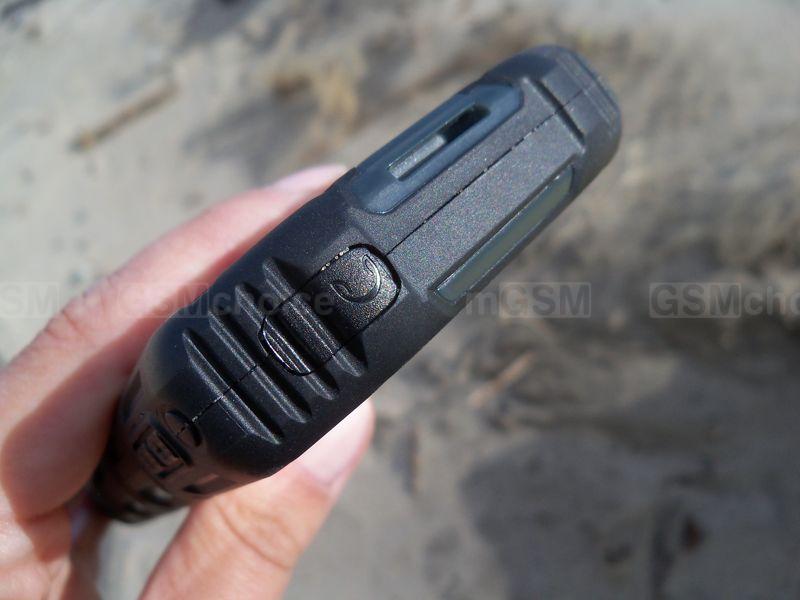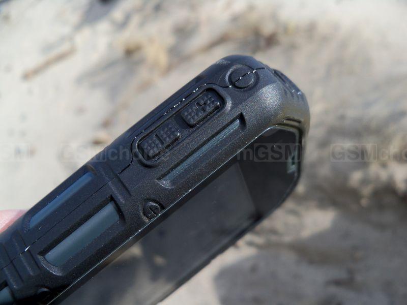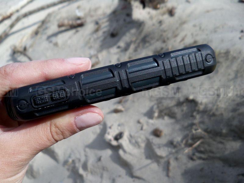 Budowa smartfonu nie należy do skomplikowanych. Z frontu mamy 4-calowy ekran otoczony znacznymi ramkami. Plusem jest fakt, iż jego powierzchnia nie wystaje poza krawędź obudowy, co pozytywnie wpływa na wytrzymałość tego elementu. Pod wyświetlaczem znalazły się podświetlane, dotykowe klawisze systemowe (szkoda, że bez funkcji ciągłego podświetlania) i mikrofon, w górnej zaś części głośnik telefonu, czujniki i kamerka do wideorozmów. Na górnej krawędzi mamy uchwyt do smyczy i uniwersalne gniazdo słuchawkowe, na dolnej port microUSB - obydwa porty zabezpieczone są uszczelniającymi zaślepkami. Na bocznych krawędziach standardowo jest miejsce fizycznych klawiszy - w tym przypadku są one dość niewygodne, małe i twarde. Na lewej stronie znalazła się regulacja głośności, na prawej zaś włącznik/blokada ekranu oraz klawisz spustu migawki (niezbyt komfortowy w użyciu na co dzień, ale sprawdzi się w zdjęciach pod wodą).