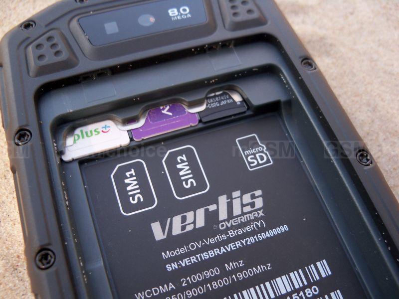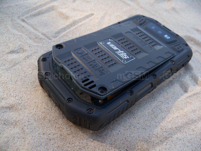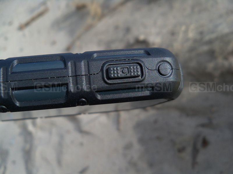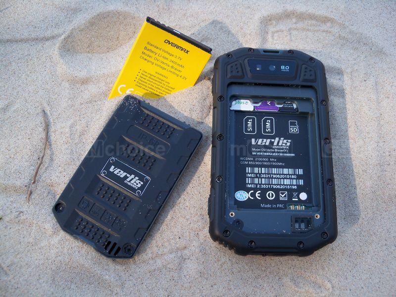 Tylny panel to kolejne gumowe przestrzenie pełne żłobień, podkreślające pancerny charakter smartfonu. Zaufanie budzi solidnie przyśrubowana obudowa. W górnej części panelu znajdziemy 8-megapikselowy aparat z diodą doświetlającą, z kolei jego centralną część zdominowała klapka z oznaczeniem certyfikatu i oznaczeniami innych możliwości urządzenia, przynitowaną blaszką z logiem producenta oraz otwory głośnika zewnętrznego. Zdemontowanie klapki możliwe jest dopiero po wykręceniu dwóch śrub - w ten sposób dostaniemy się do wnętrza telefonu. Na początek do baterii o pojemności 2400 mAh, po wyjęciu której mamy dostęp do gniazd kart SIM w rozmiarze mini oraz slotu na kartę microSD.