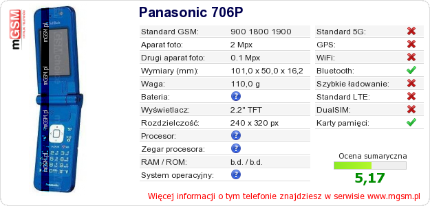 Dane telefonu Panasonic 706P na Twojej stronie