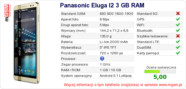 Dane telefonu Panasonic Eluga I2 3 GB RAM na Twojej stronie
