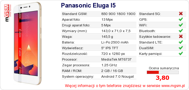 Dane telefonu Panasonic Eluga I5 na Twojej stronie