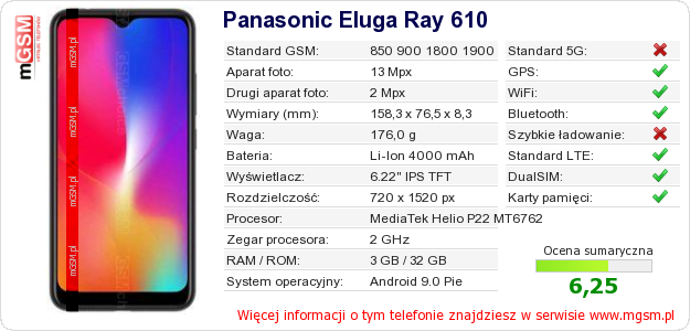 Dane telefonu Panasonic Eluga Ray 610 na Twojej stronie