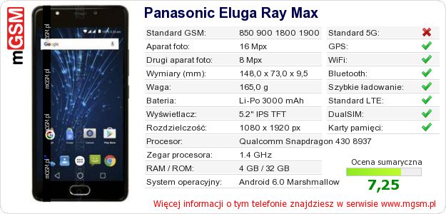 Dane telefonu Panasonic Eluga Ray Max na Twojej stronie