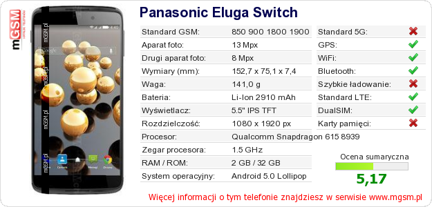 Dane telefonu Panasonic Eluga Switch na Twojej stronie