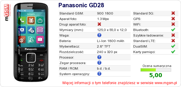 Dane telefonu Panasonic GD28 na Twojej stronie