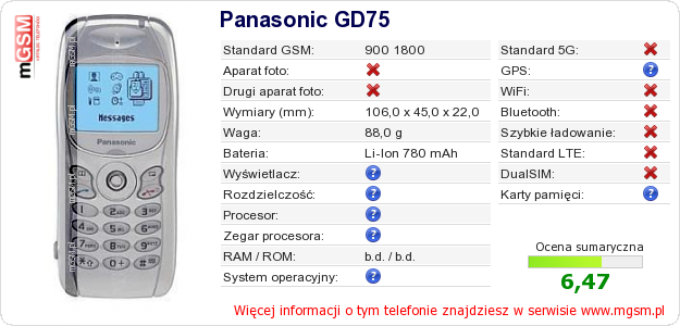 Dane telefonu Panasonic GD75 na Twojej stronie