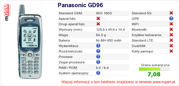 Dane telefonu Panasonic GD96 na Twojej stronie