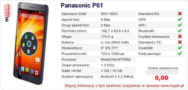Dane telefonu Panasonic P61 na Twojej stronie