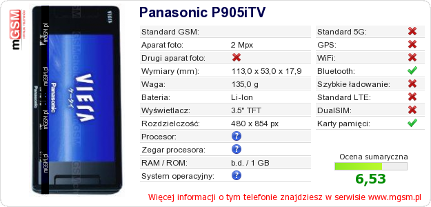 Dane telefonu Panasonic P905iTV na Twojej stronie