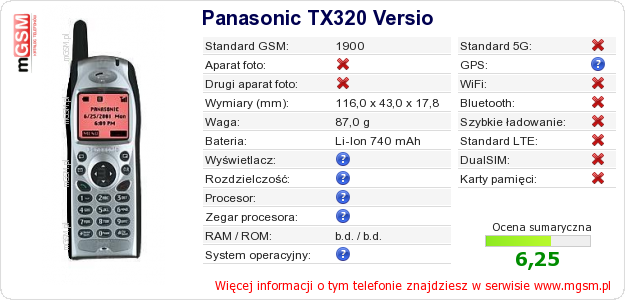 Masz swoją stronę? Chcesz wstawić gdzieś informacje o podstawowych danych telefonu Panasonic TX320 Versio ? To bardzo proste. Możesz pobrać obrazek, lub skopiować i wkleić na stronę poniższy kod:Wklejenie tego kodu spowoduje wyświetlenie poniższego obrazka: