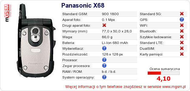 Dane telefonu Panasonic X68 na Twojej stronie