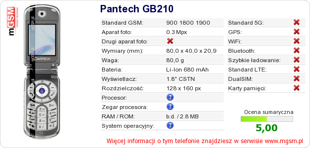 Dane telefonu Pantech GB210 na Twojej stronie