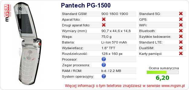 Dane telefonu Pantech PG-1500 na Twojej stronie